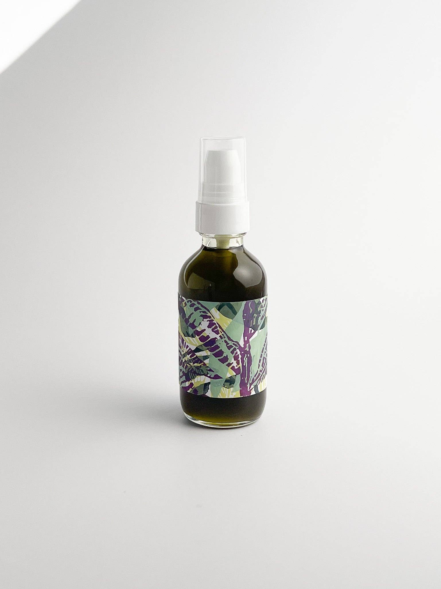 2 oz glass bottle of KABUKI OIL with pump top and unique hand printed label